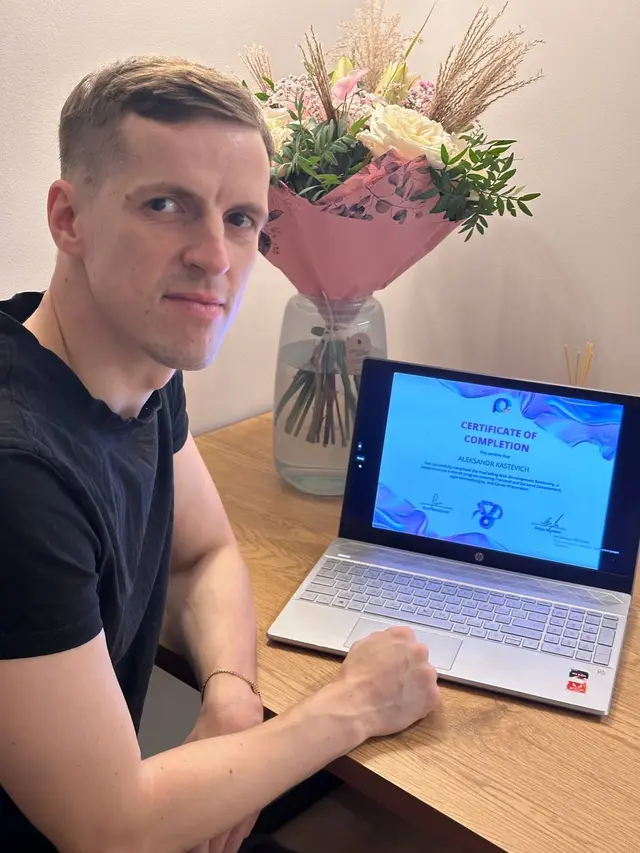 Web‑Dev focus group. I used to work as an appliance repair technician, and I was lucky to get into the focus group. The course is very detailed — you immediately see your progress. Most things are clear in class, and at home you just practice. Now I do freelance projects in the evenings and bought myself a new car from freelancing alone. I haven’t landed a full‑time developer job yet — interviews are tough for me…